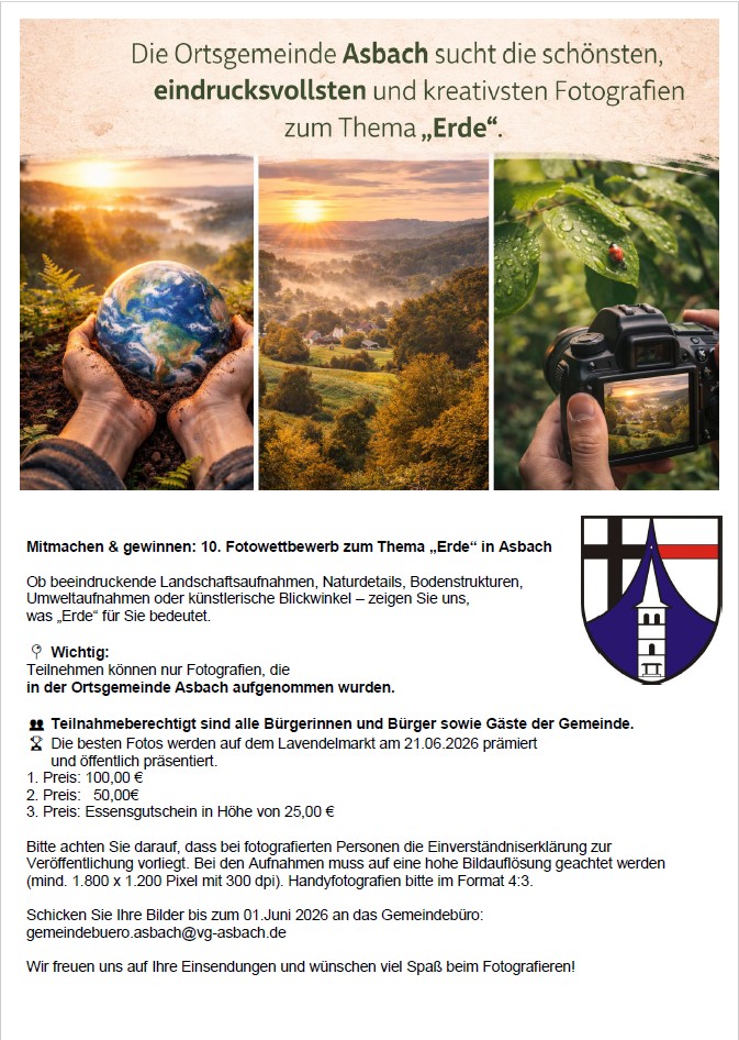 Auch in diesem Jahr ruft die Ortsgemeinde Asbach alle Hobbyfotografen auf am Fotowettbewerb zum  Thema "Erde" mitzumachen.